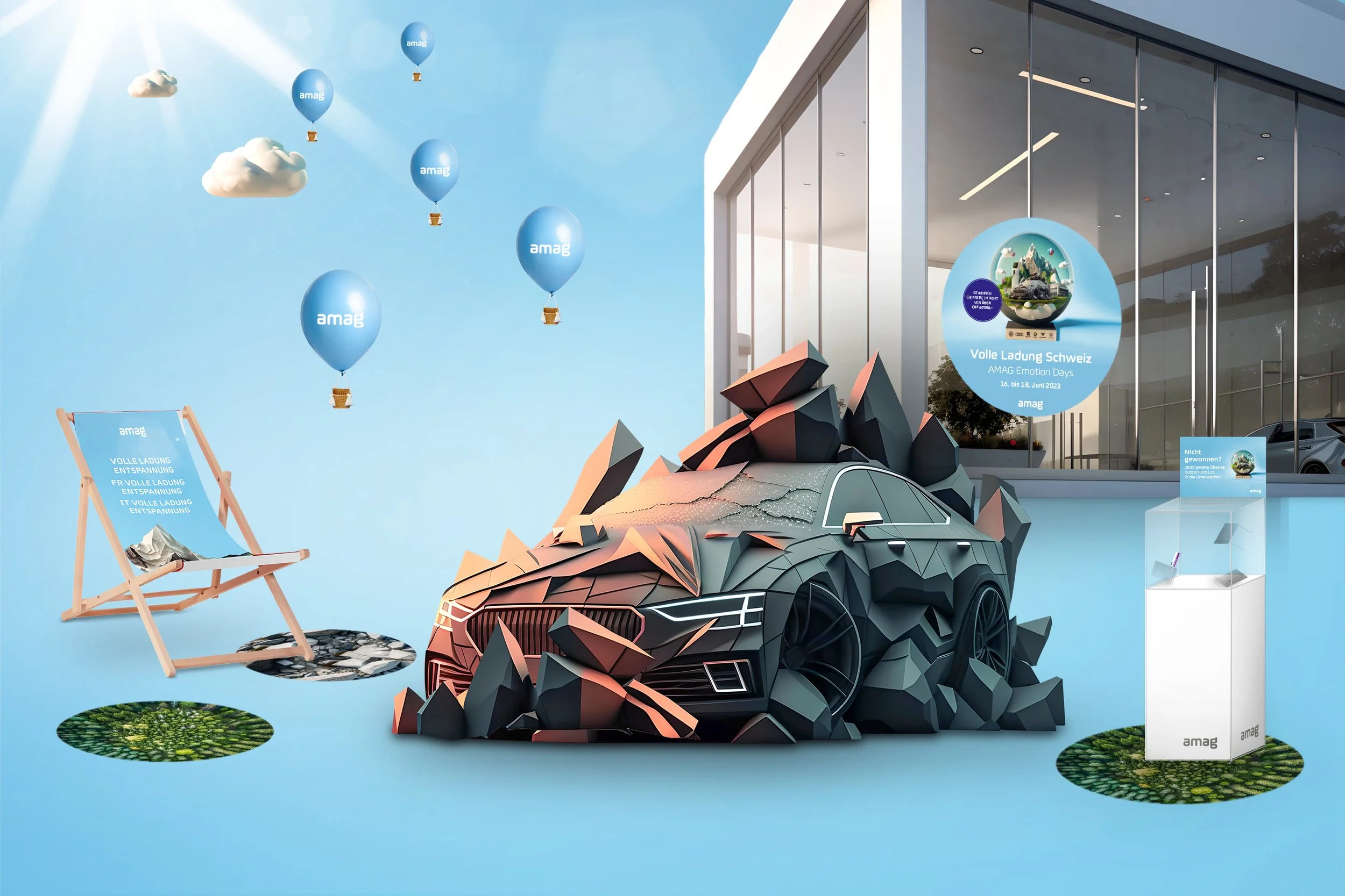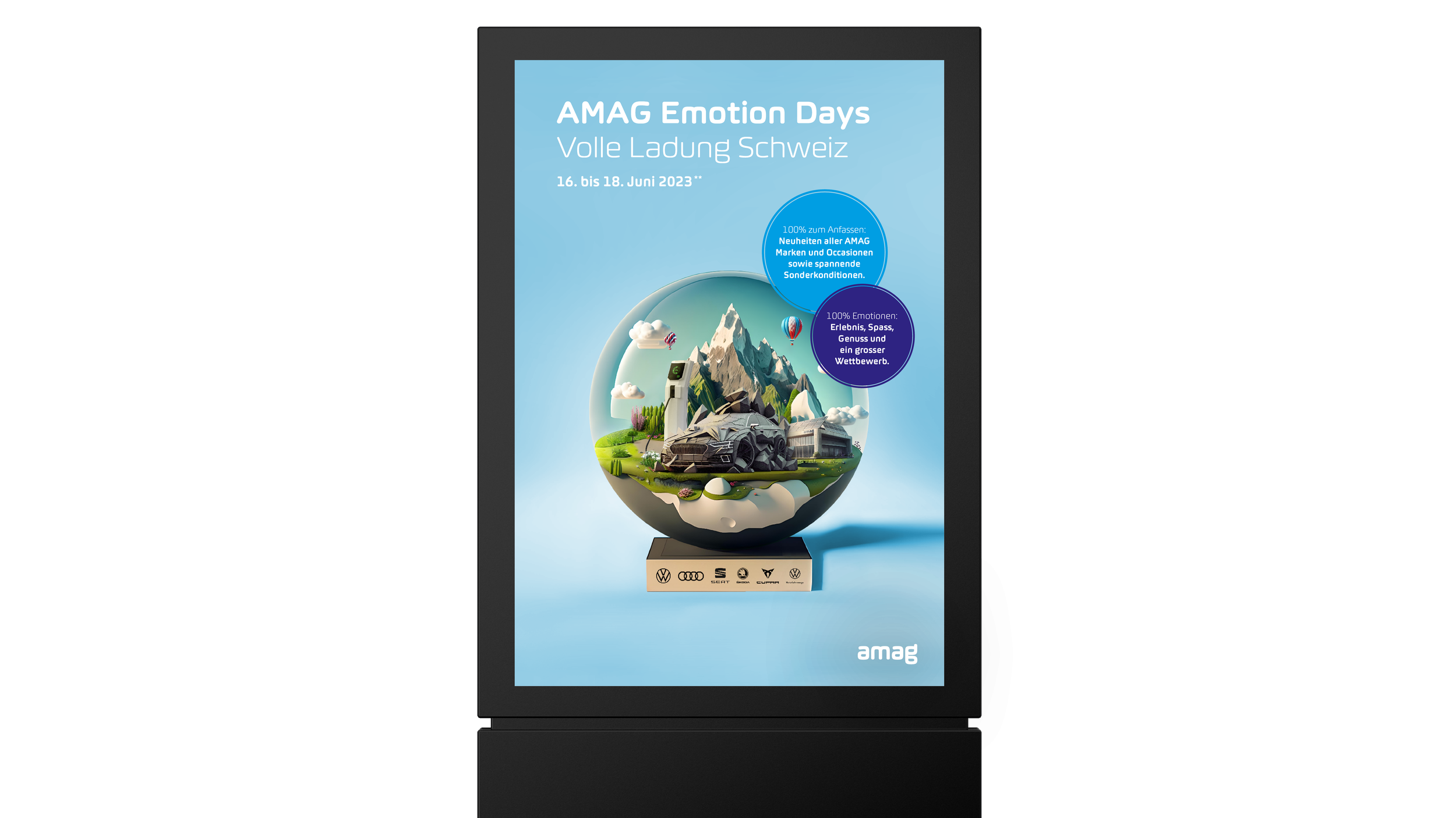 Unter dem Motto «Volle Ladung Schweiz» wurden an einem Frühlings-Wochenende in allen AMAG Retail Filialen die Emotion Days gefeiert. Sämtliche Visuals und POS-Materialien wurden dabei mit Unterstützung künstlicher Intelligenz kreiert.